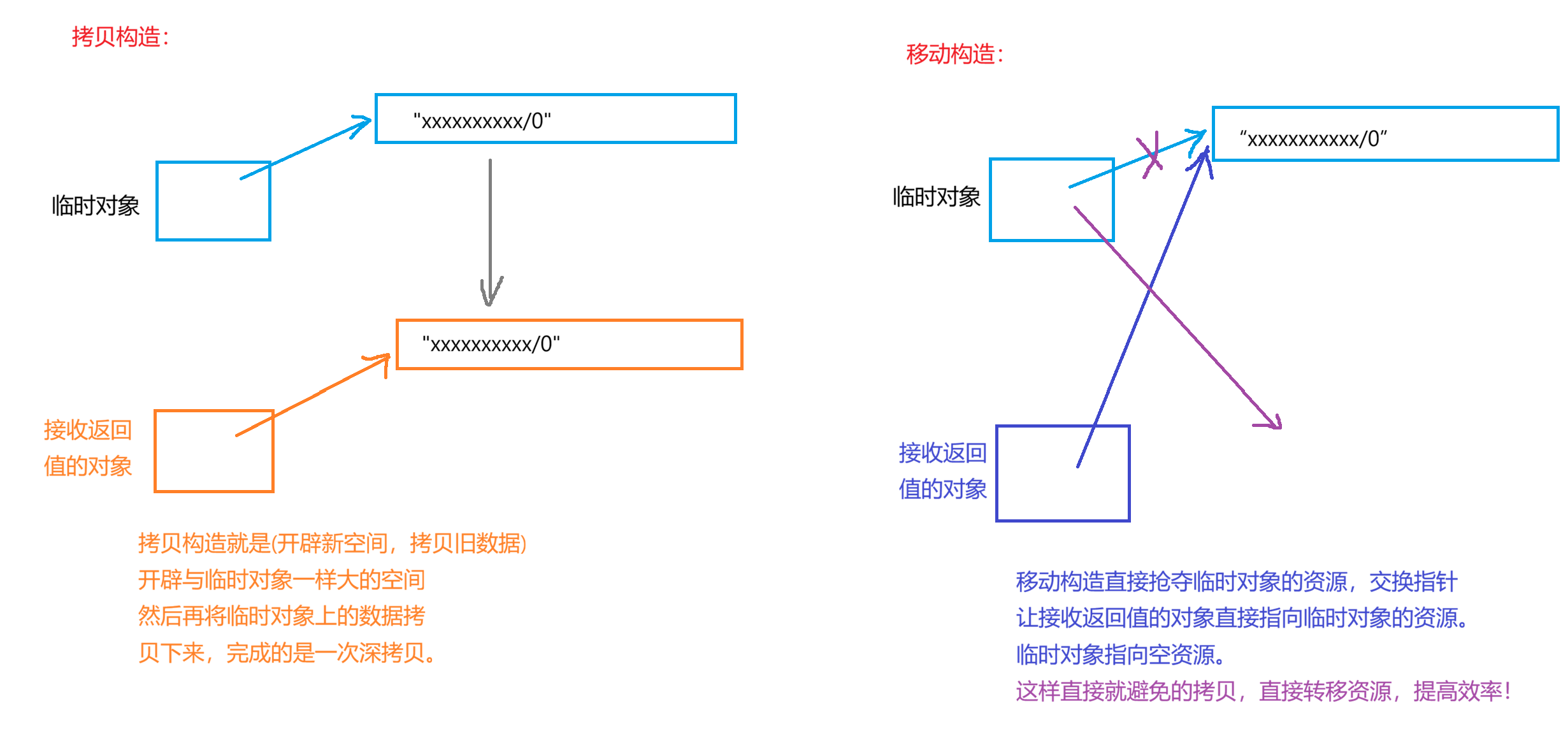 - 移动构造: 是⼀种构造函数,类似拷贝构造函数,移动构造函数要求第⼀个参数是该类类型的引用 ,但是不同的是要求这个参数是右值引用,如果还有其他参数,额外的参数必须有缺省值。 下面用一张图来说清楚移动构造和拷贝构造的区别: