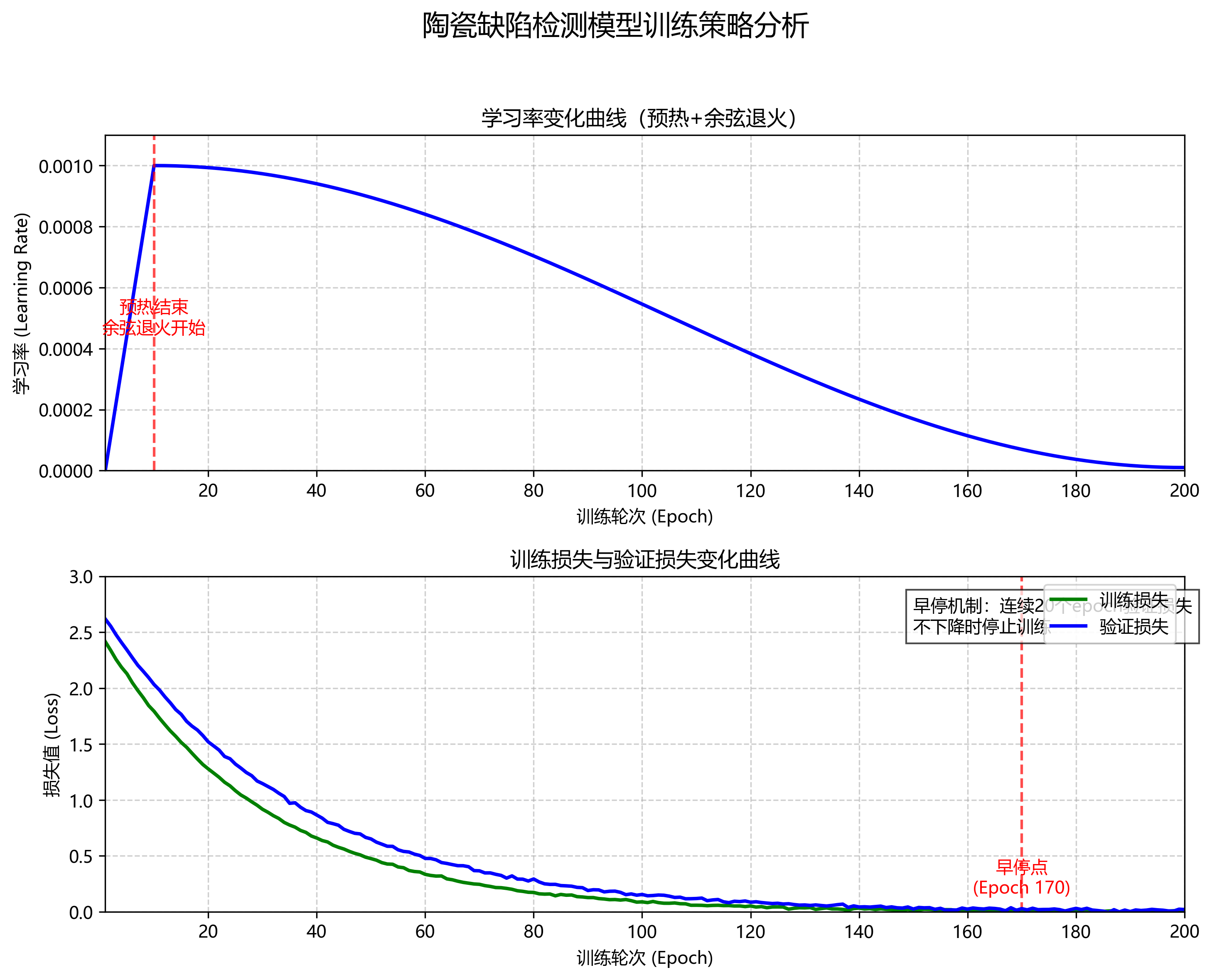 模型训练是深度学习系统开发的核心环节。在陶瓷缺陷检测任务中,我们使用了包含5000张图像的自建数据集,涵盖了裂纹、气泡、划痕、色差等常见陶瓷缺陷类型。训练过程中,我们采用了迁移学习策略,首先在ImageNet数据集上预训练模型,然后在陶瓷缺陷数据集上进行微调。为了防止过拟合,我们使用了数据增强技术,包括随机旋转、缩放、裁剪和颜色抖动等。训练过程中,我们监控了mAP、精确率和召回率等指标,确保模型性能达到最佳状态。经过100个epoch的训练,模型在测试集上达到了92.5%的mAP,能够满足工业检测的精度要求。