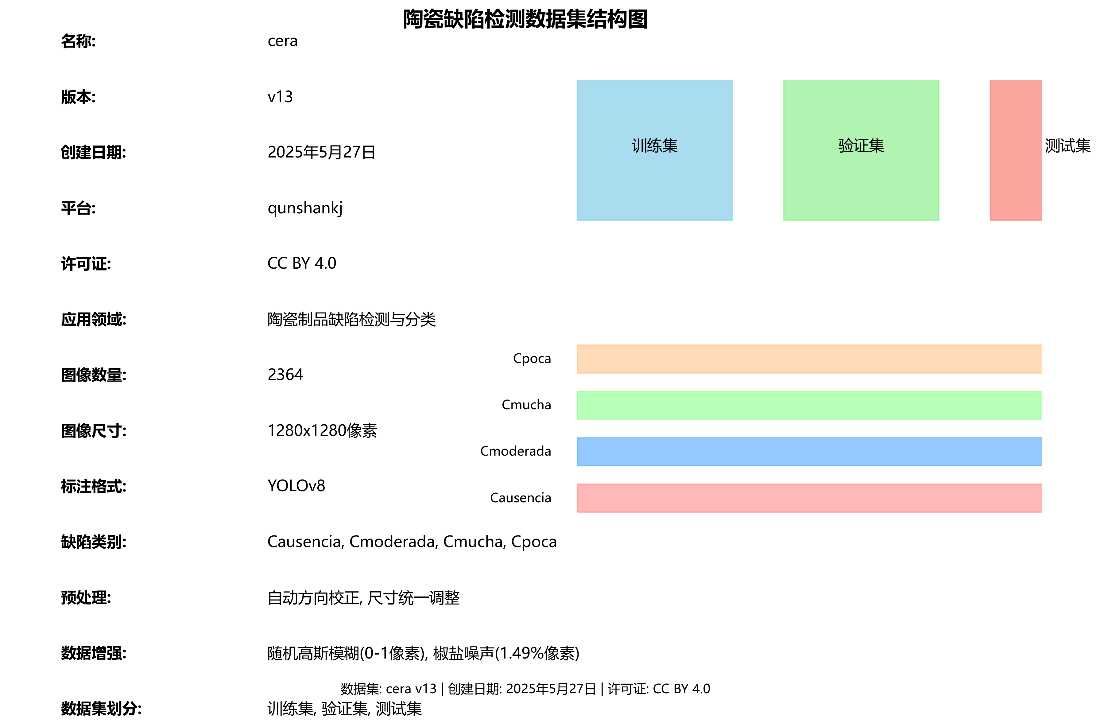 高质量的数据集是深度学习模型成功的关键。本系统构建了一个包含多种陶瓷缺陷类型的专用数据集,数据集统计信息如下表所示: