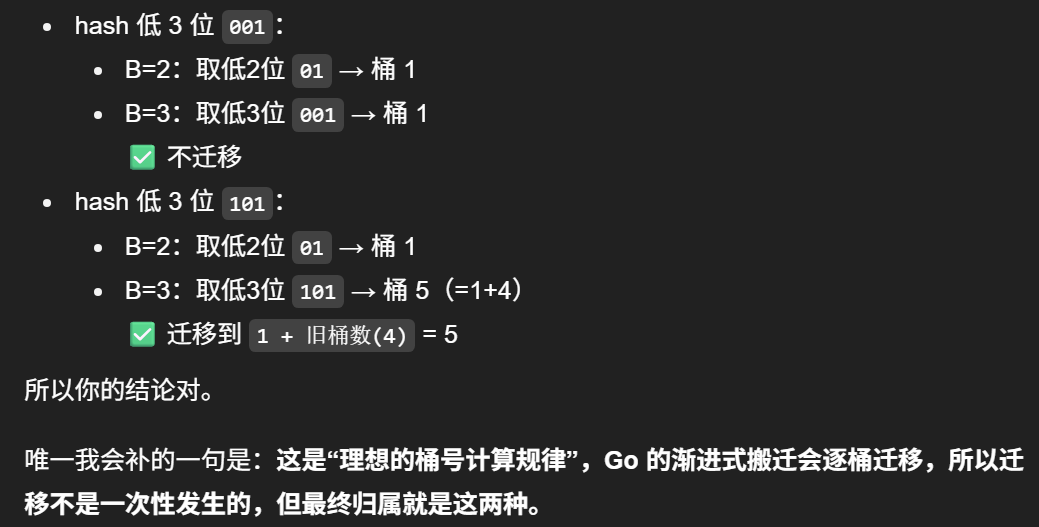 "原桶 or 原桶+旧桶数"这个规律就是 Go map 双倍扩容时最核心的搬迁逻辑