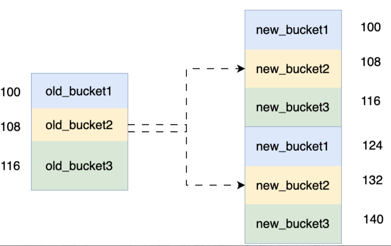 回顾一下双倍扩容, key的变化过程,双倍扩容,目标桶扩容后的位置可能在原位置也可能在原位置+偏移量处。