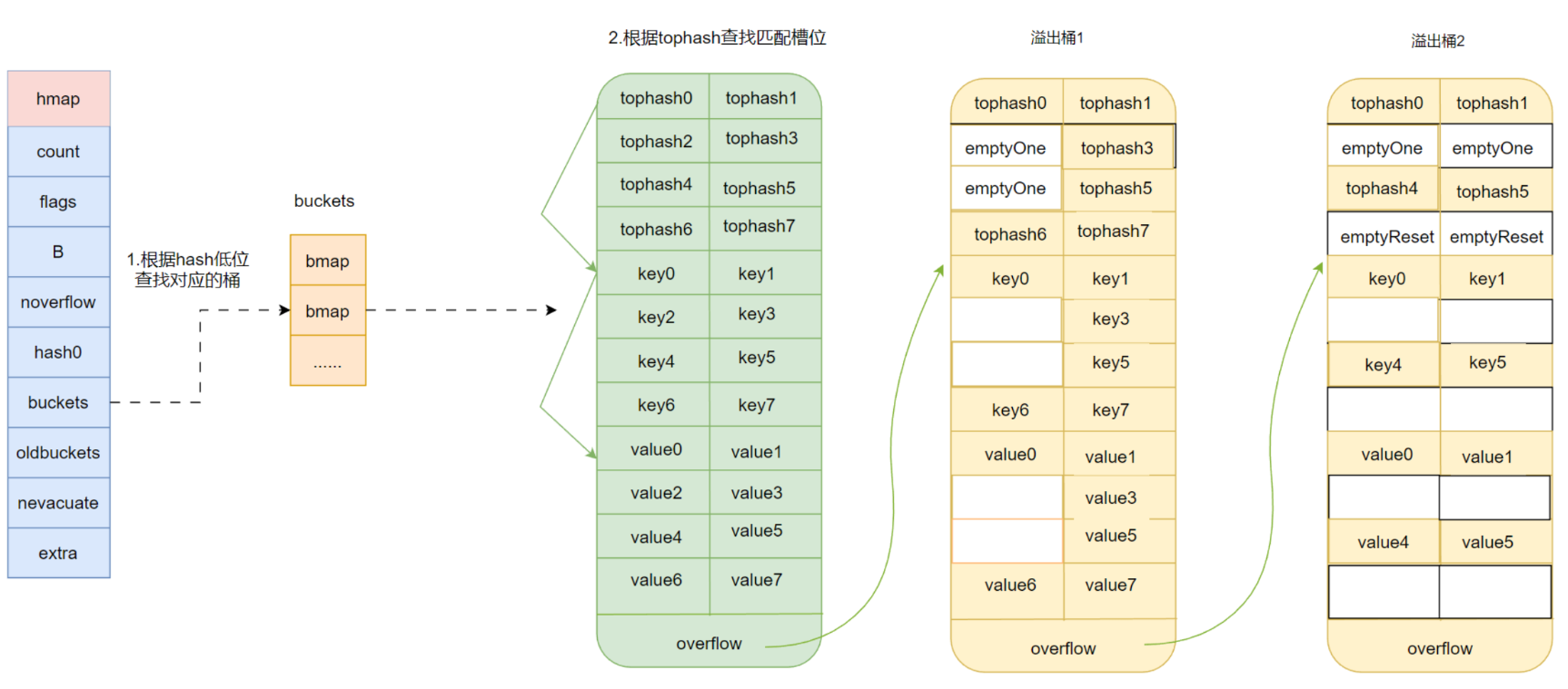假设当前map的状态如下图所示,溢出桶2后面没有在接溢出桶,或者是溢出桶2后面接的溢出桶中没有数据,溢出桶2中有三个空槽,即第2,3,6处为emptyOne,