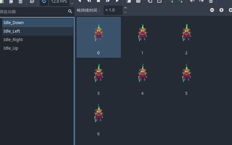 - 为另外三个方向添加待机动画 Idle_Up、Idle_Left、Idle_Right,添加对应动画帧,设置循环和 12fps。