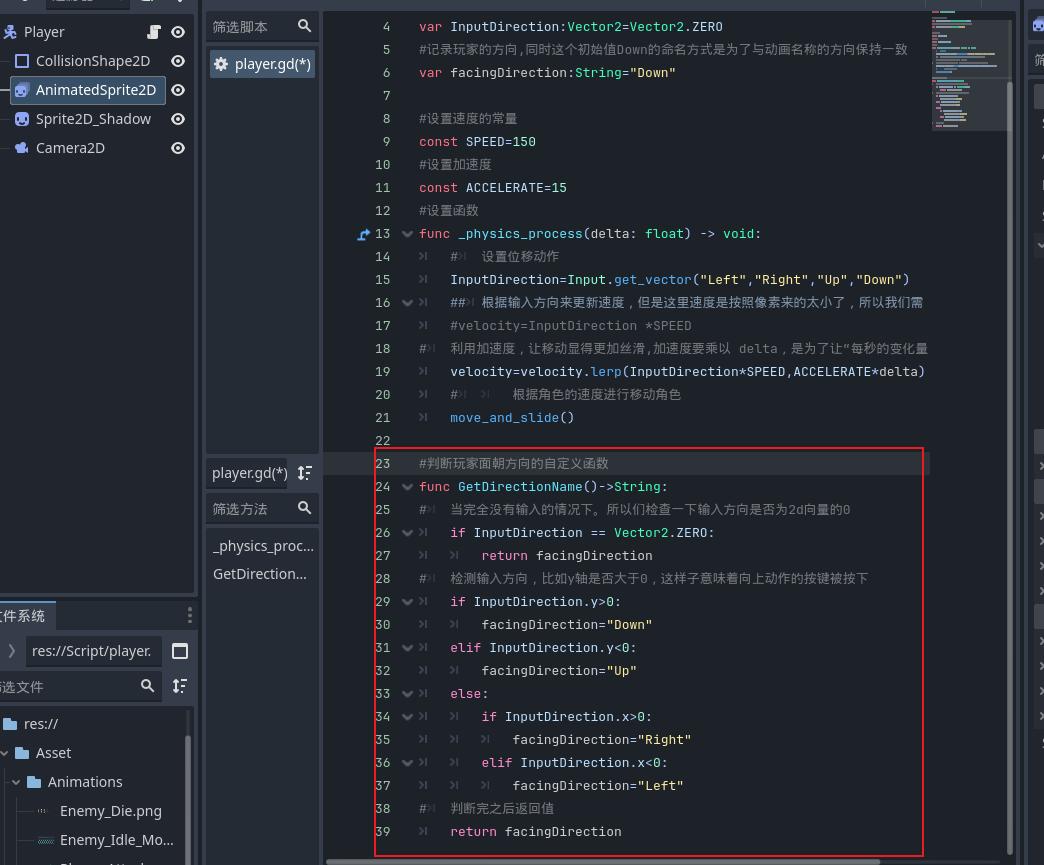 - 新建自定义函数判断玩家输入方向并记录朝向。