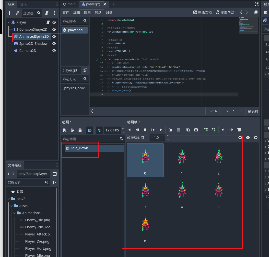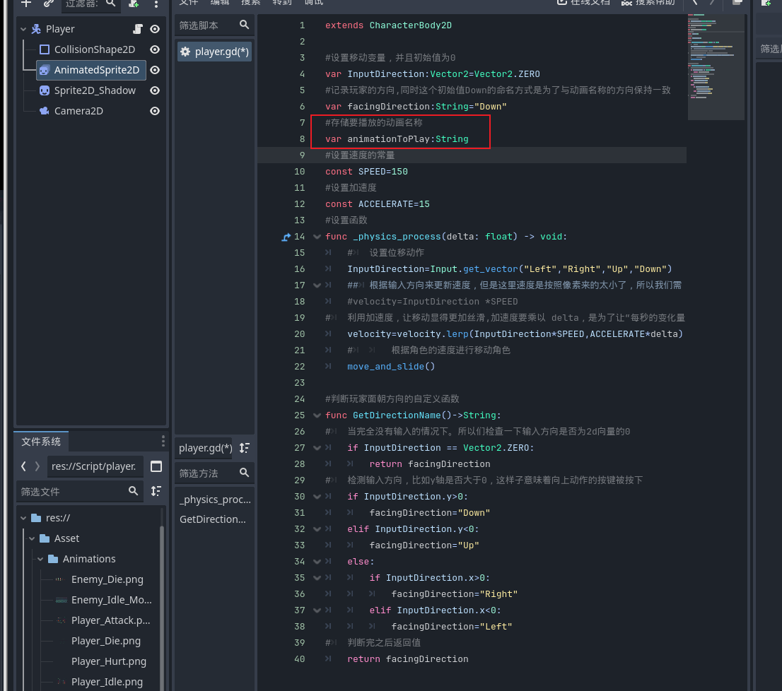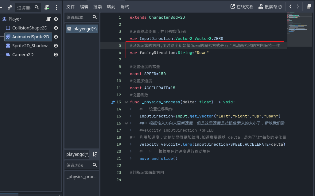 - 在玩家场景脚本代码顶部声明变量记录玩家当前面对方向,初始值 Down 与动画方向命名一致。