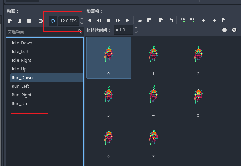 - 为奔跑添加四个方向动画 Run_down、Run_Up、Run_Left、Run_Right,设置循环播放和 12fps。