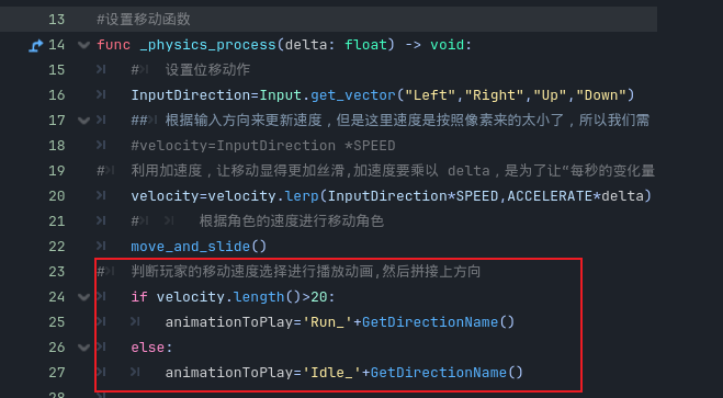 - 然后我们来到移动的函数那里,在下面进行判断,如果说玩家的移动速度大于20,那就播放跑步的动画,小于20就是待机动画,并且拼接一下玩家的朝向