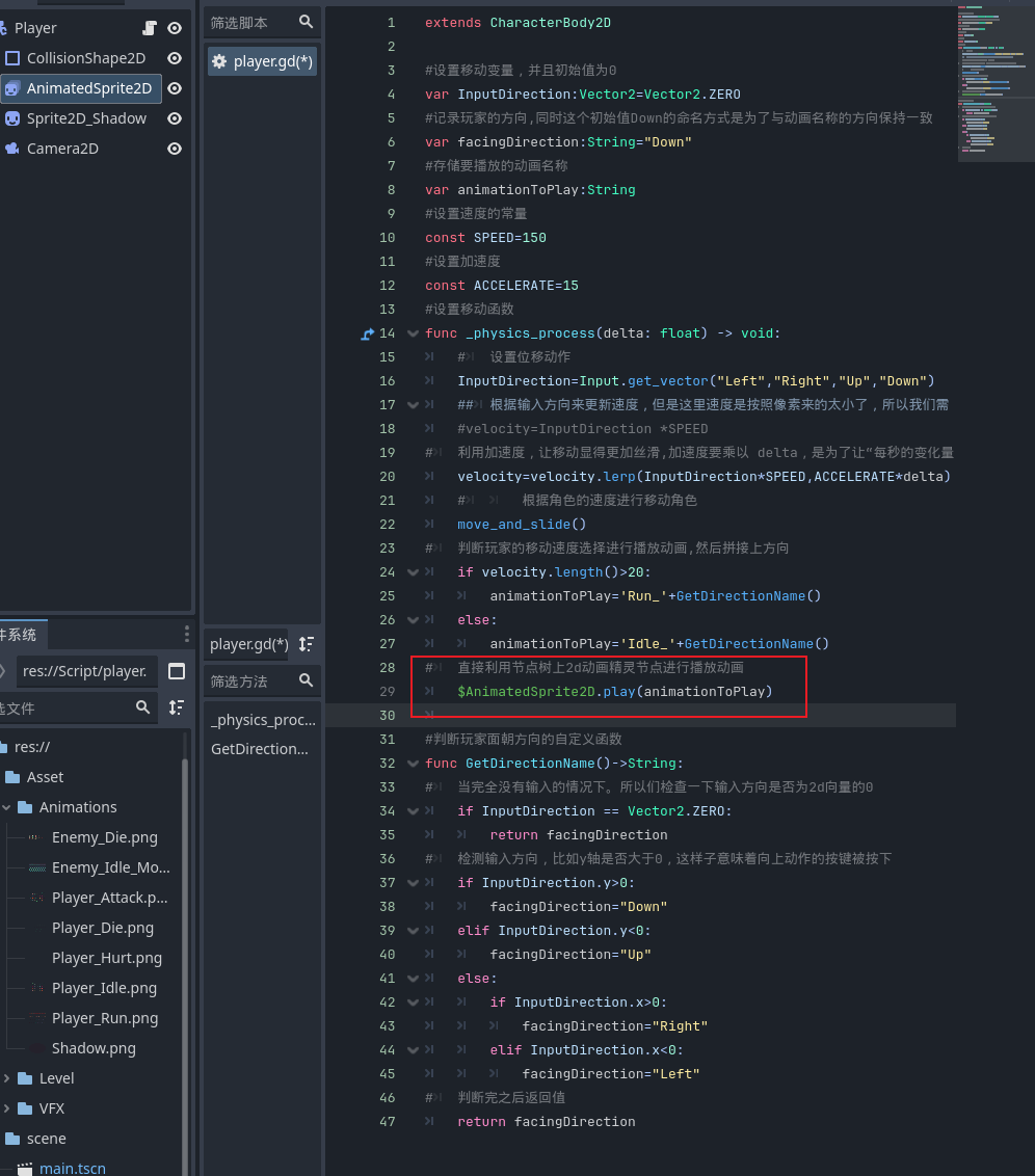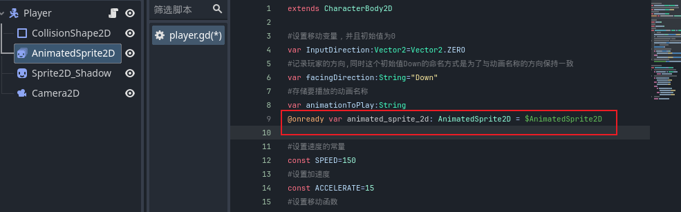 - 在设置完动画之后,我们来到玩家场景的脚本代码中,我们先在顶部声明一个变量来记录玩家当前面对的方向,同时这个初始值Down的命名方式是为了与动画名称的方向保持一致