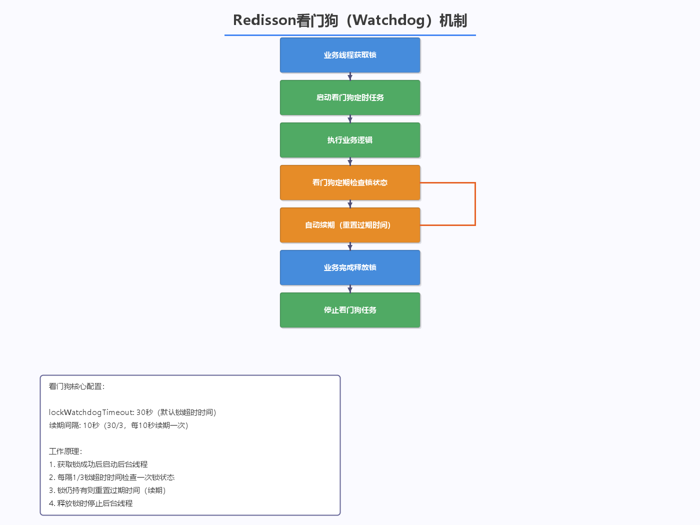 看门狗(Watchdog)是Redisson的核心特性,用于解决锁超时问题: