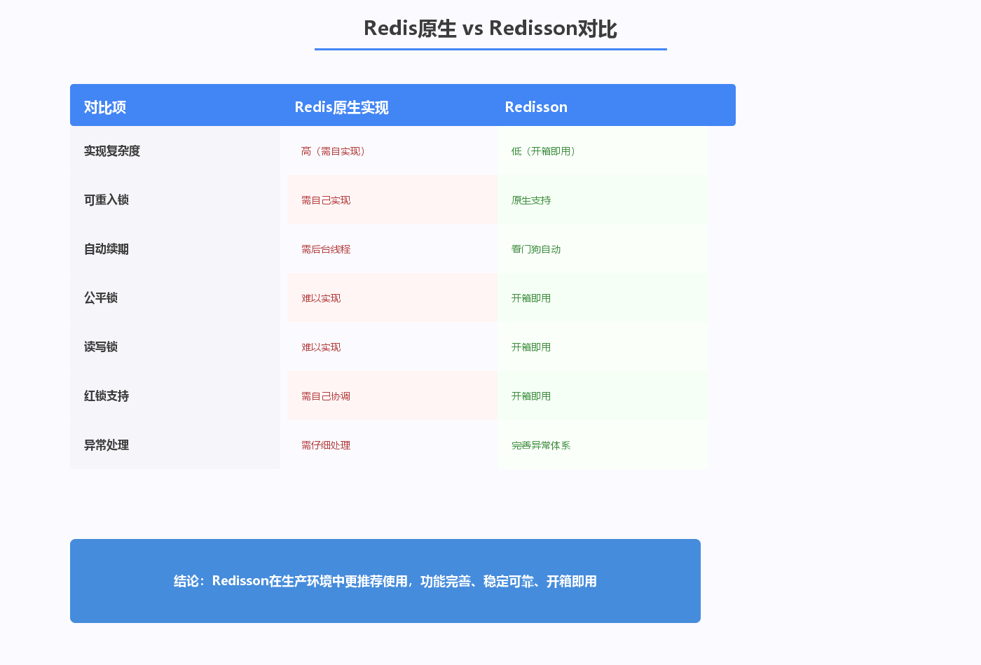 结论:生产环境推荐使用Redisson,它已经处理了各种边界情况和异常场景。