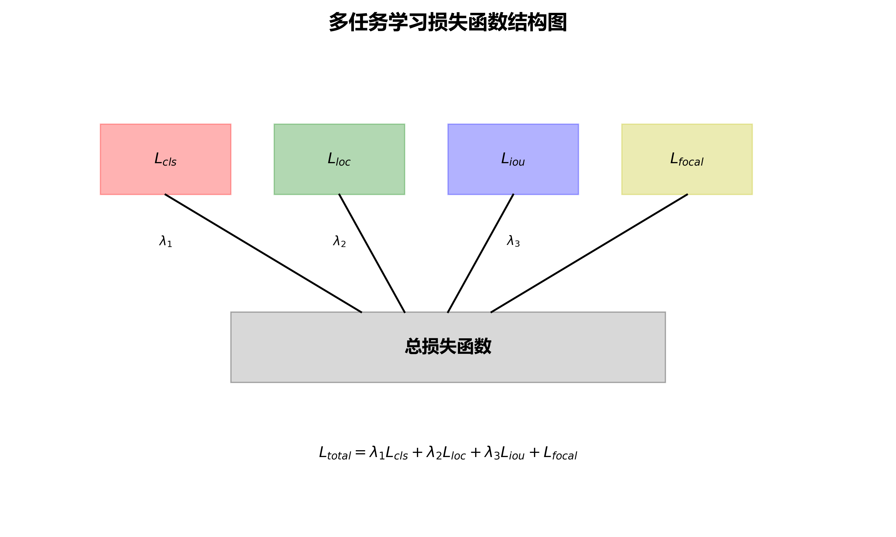 其中, L c l s L_{cls} Lcls是分类损失, L l o c L_{loc} Lloc是定位损失, L i o u L_{iou} Liou是交并比损失, L f o c a l L_{focal} Lfocal是focal损失, λ 1 \lambda_1 λ1、 λ 2 \lambda_2 λ2和 λ 3 \lambda_3 λ3是平衡不同损失项的权重系数。