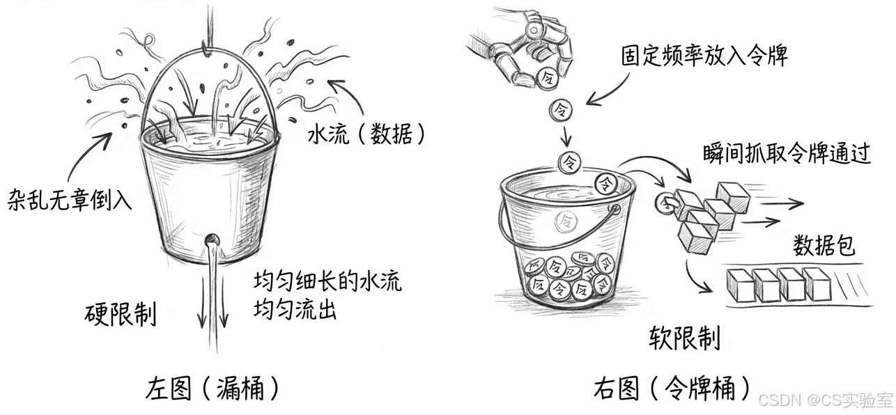 - 特点:强制输出速率恒定,适合平滑流量,但无法处理突发数据。