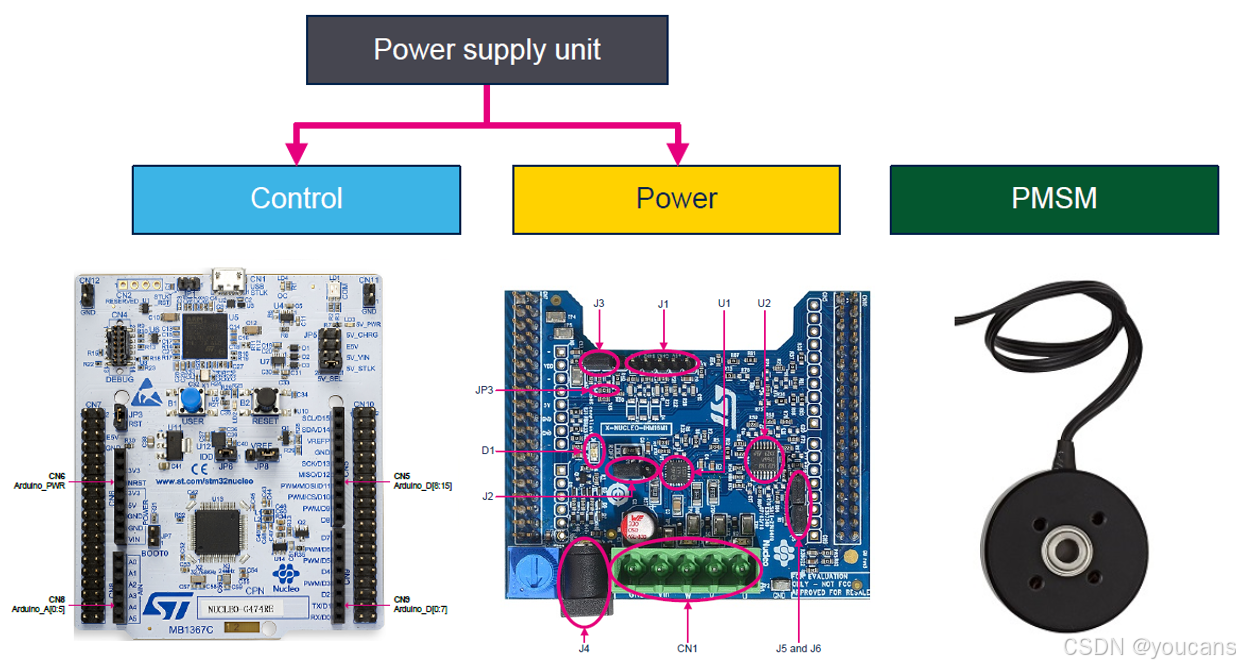 将 12V/2A 直流电源连接到 NUCLEO-G431RB 控制板上的 CN1 连接端口(mini-USB),或连接到 X-NUCLEO-IHM16M1 电机驱动板上的 J4 连接器(电源插座),并通电(IHM03 套件中标配的云台电机的最大电压为12 VDC-youcans)。