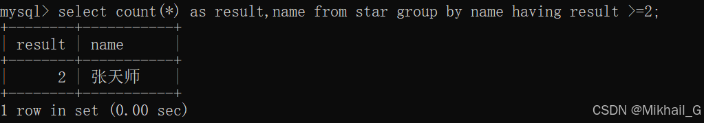 语法:select count(*) as result,字段 from 数据表名字 group by 字段 having 条件;