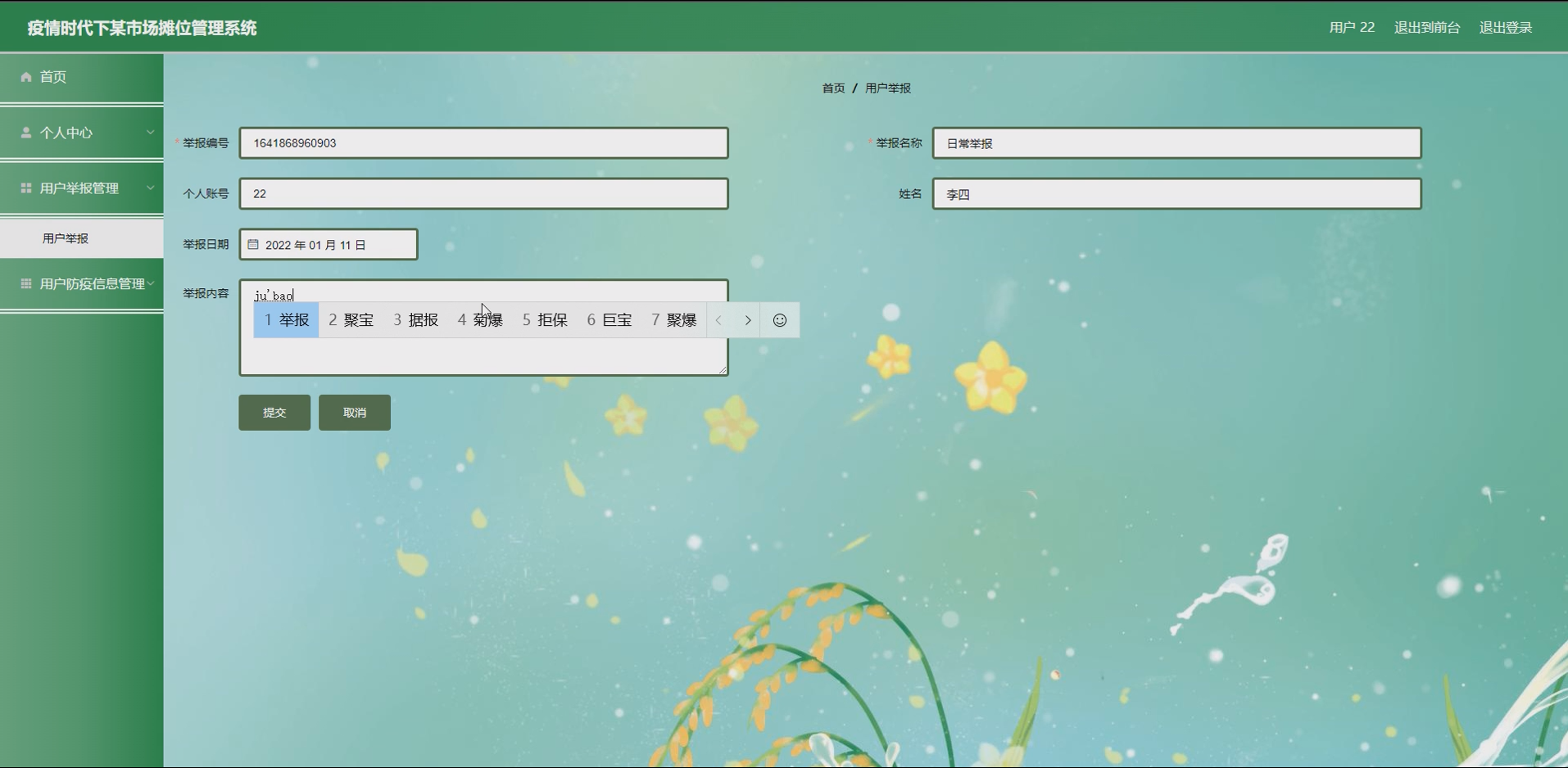 核心功能:用户账号注册、登录、个人信息修改与查看;查看市场摊位信息、摊主基本信息;提交用户防疫信息(体温、出行轨迹等);对违规摊主进行举报,查看举报记录及处理进度,助力市场防疫管控。