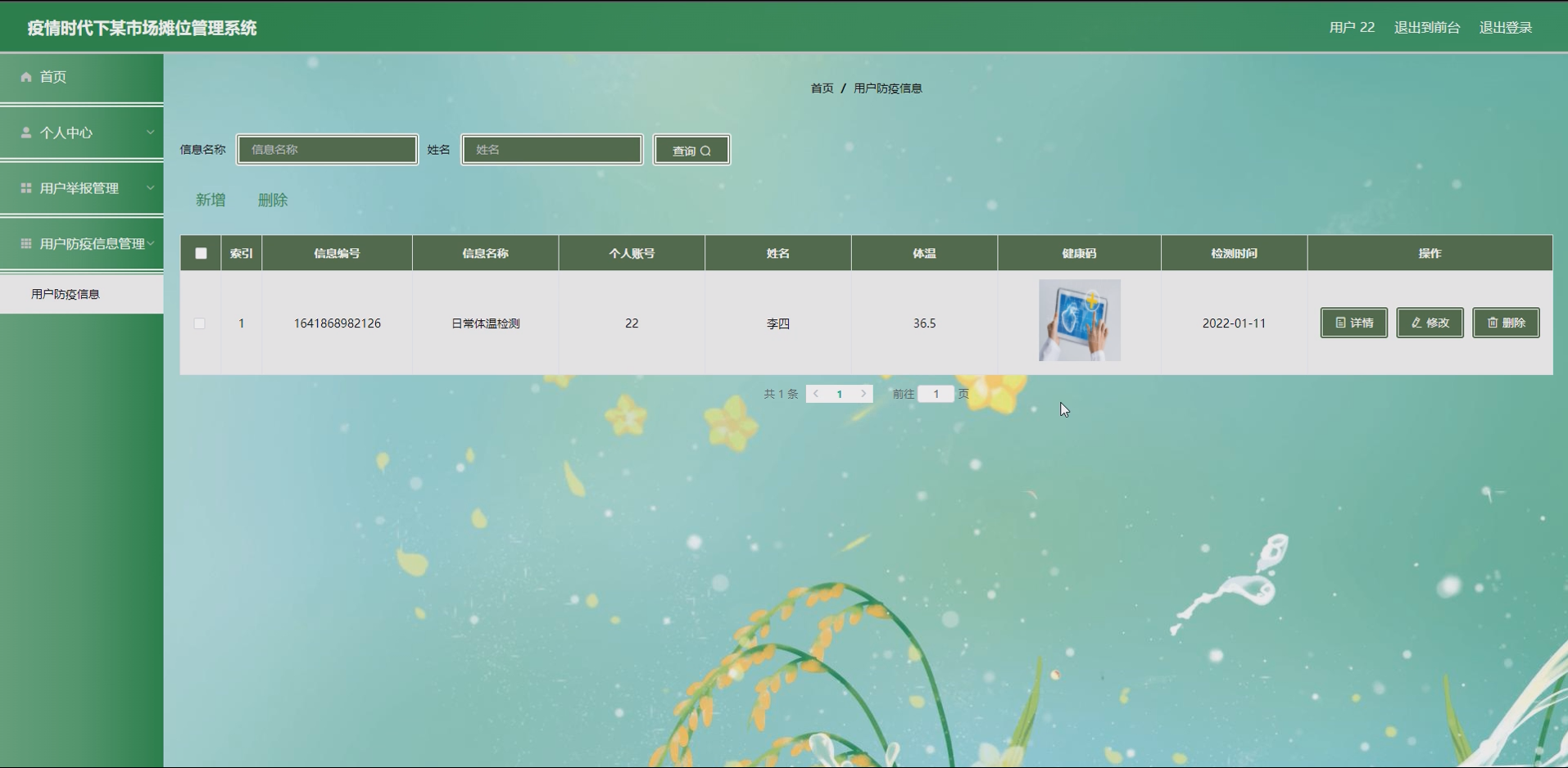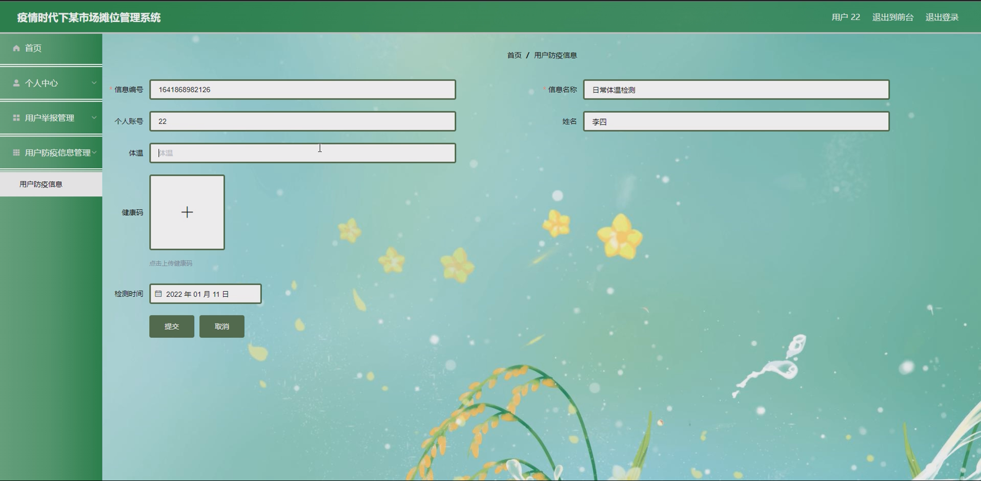 核心功能:用户进入市场前提交个人防疫信息(体温、健康码状态、近期出行轨迹等);市场管理员查看、统计用户防疫信息,对防疫异常人员进行管控;实现用户防疫信息的实时登记与追溯,筑牢市场防疫防线。