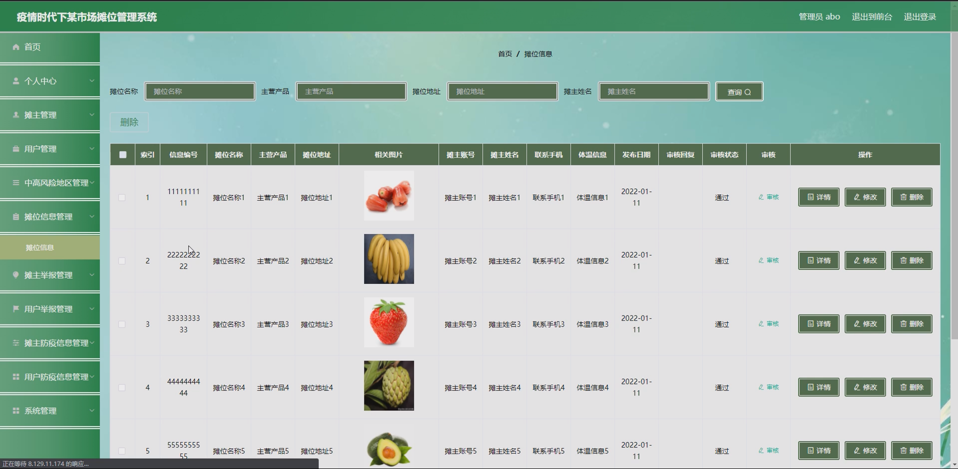 核心功能:市场管理员添加、修改、删除、查询市场摊位信息(摊位编号、位置、面积、经营范围、租赁状态等);审核摊主提交的摊位绑定申请;查看摊位防疫落实情况,对违规摊位进行管控,实现摊位信息的系统化管理。