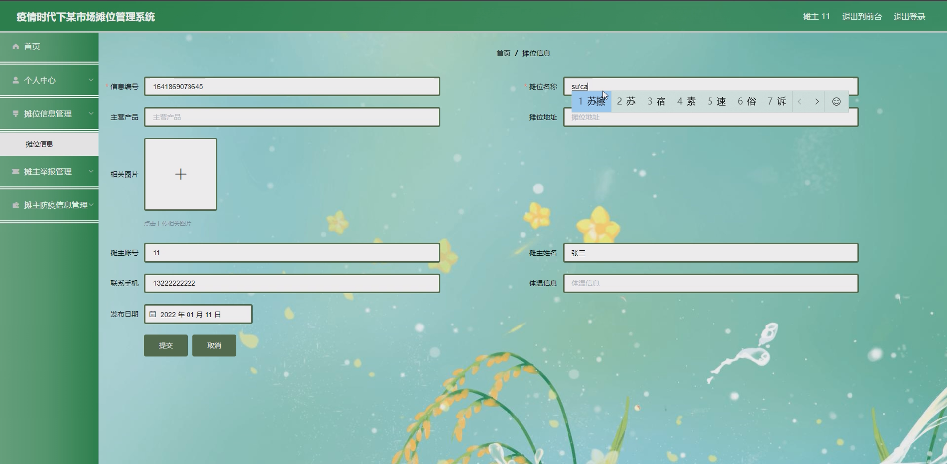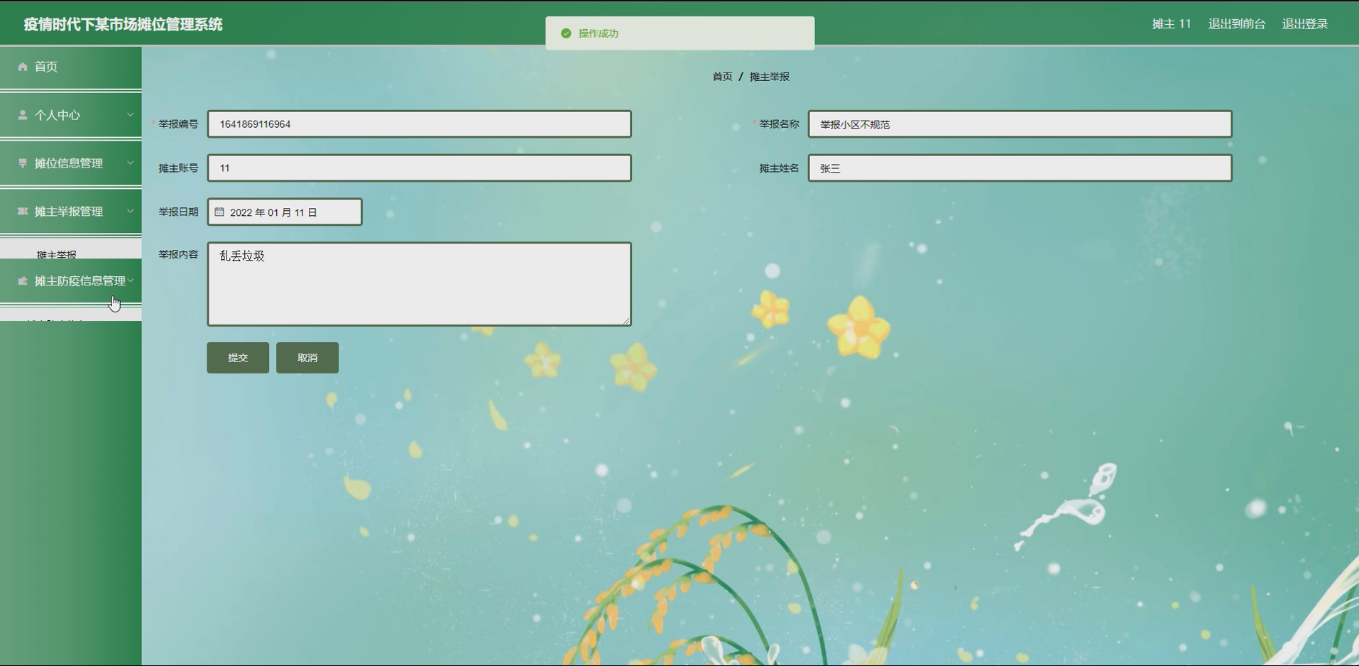 核心功能:摊主账号注册、登录、个人信息修改与查看;绑定个人摊位信息,查看摊位审核状态;提交个人防疫信息(体温、核酸检测结果等);查看自身被举报记录及处理结果,反馈相关异议,实现摊主自身信息的规范化管理。