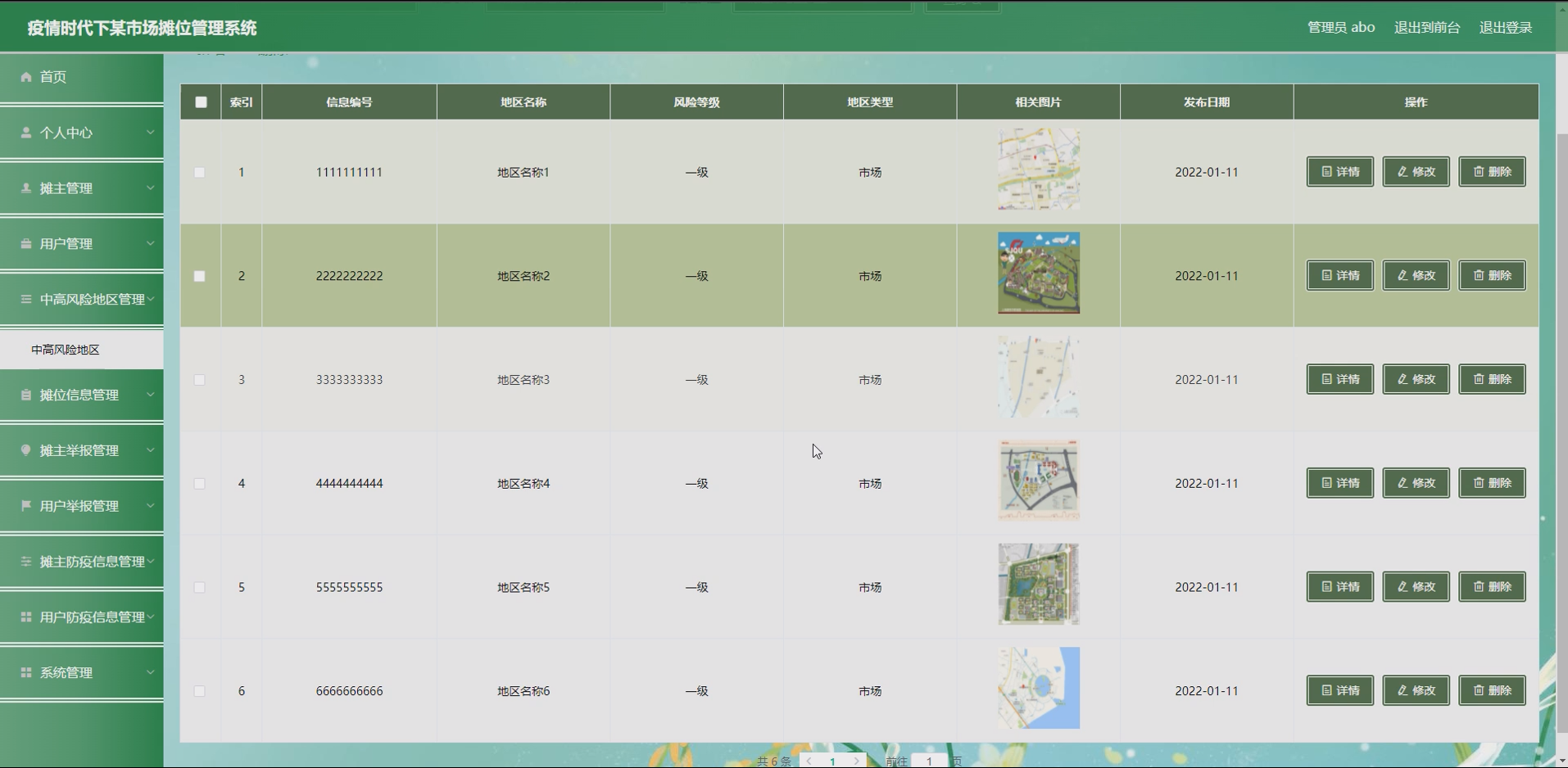 核心功能:市场管理员添加、修改、删除、查询中高风险地区信息(地区名称、风险等级、划定时间等);系统自动关联摊主、用户的所在地信息,对来自中高风险地区的人员进行标记提醒,助力精准防疫。