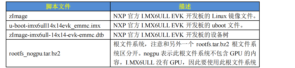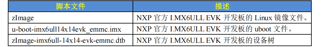 上表中的这三个文件就是 I.MX6ULL EVK 开发板烧写系统的时候第一阶段所需的文件。