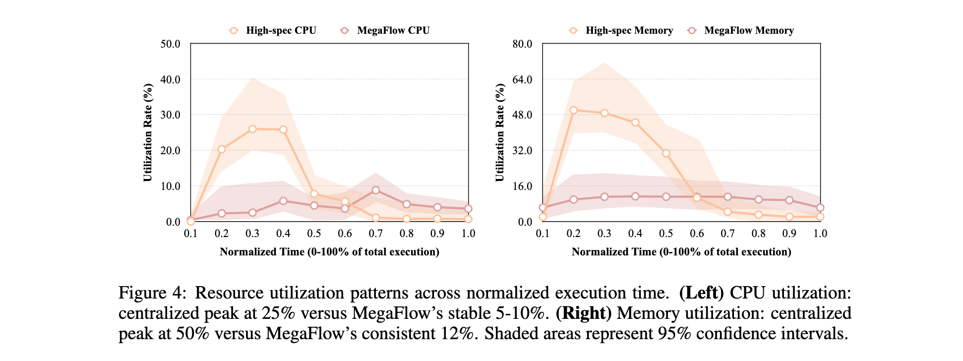 资源利用率分析 :图4展示了资源利用率对比。高规格集中式实例CPU利用率在初始30%期间达到25%峰值后下降,内存利用率在执行中期达到50%峰值后急剧下降。MegaFlow的分布式架构CPU利用率稳定在5-10%,内存利用率保持约12%。对比模式突显了效率差异,集中式方法表现出"突发性"资源消耗和大量空闲期。