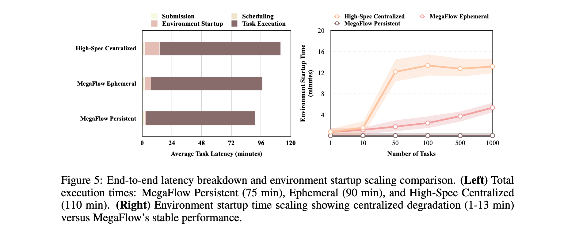 端到端延迟分析 :图5的延迟分解显示,MegaFlow的持久执行模式总延迟约75分钟,短暂模式约90分钟,高规格集中式方法约110分钟。环境启动时间方面,高规格集中式方法从1分钟退化到13分钟,MegaFlow短暂模式从1分钟增长到6分钟,持久执行保持低于1分钟。图5右侧清晰展示了这种可扩展性差异。