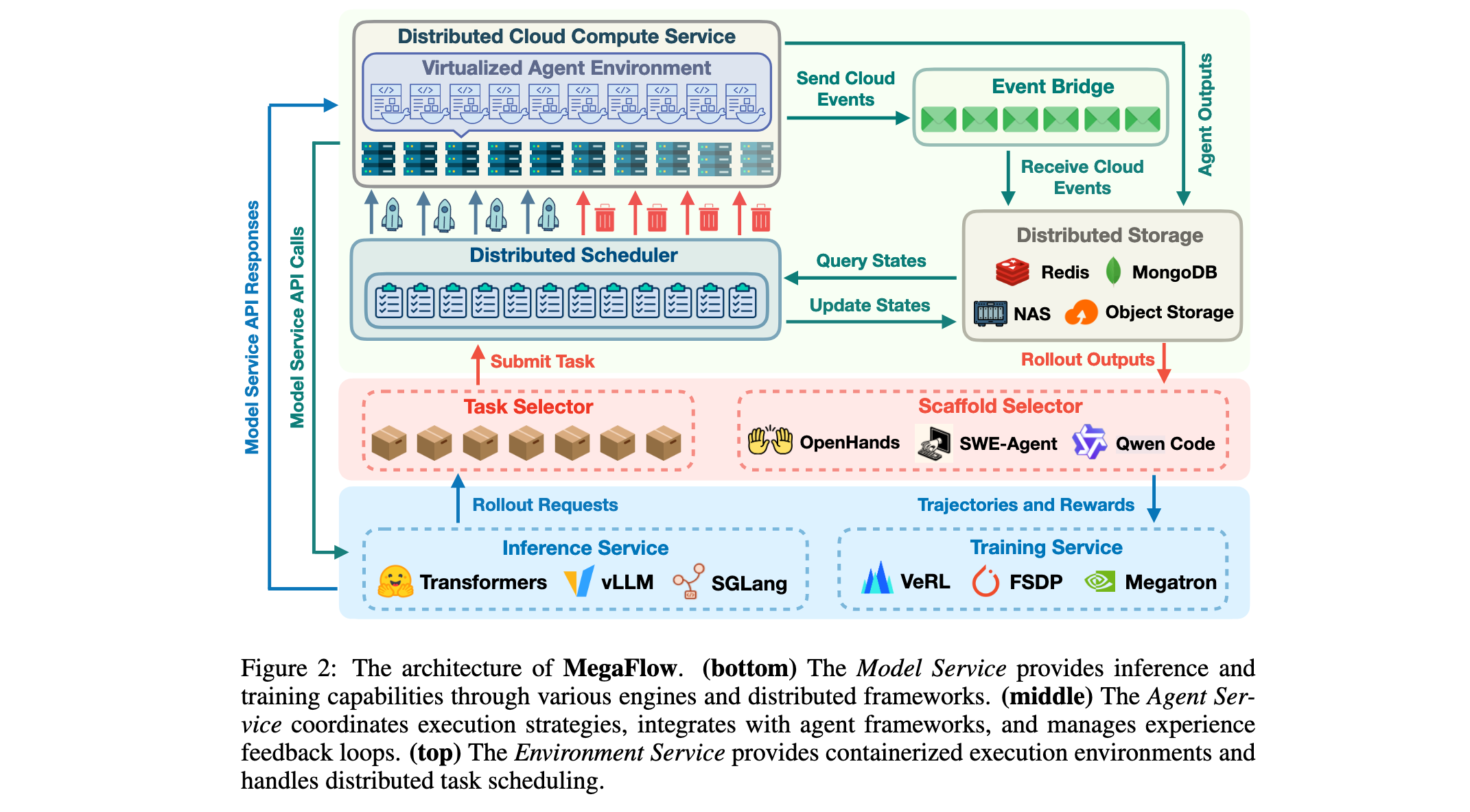 MegaFlow的核心创新在于将Agent训练基础设施抽象为三个独立服务(Model Service、Agent Service、Environment Service),通过统一接口交互,实现独立扩展和灵活资源分配。图2详细展示了MegaFlow的完整系统架构,从底部的Model Service提供推理和训练能力,通过中间的Agent Service协调执行策略,到顶部的Environment Service提供容器化执行环境和分布式任务调度。