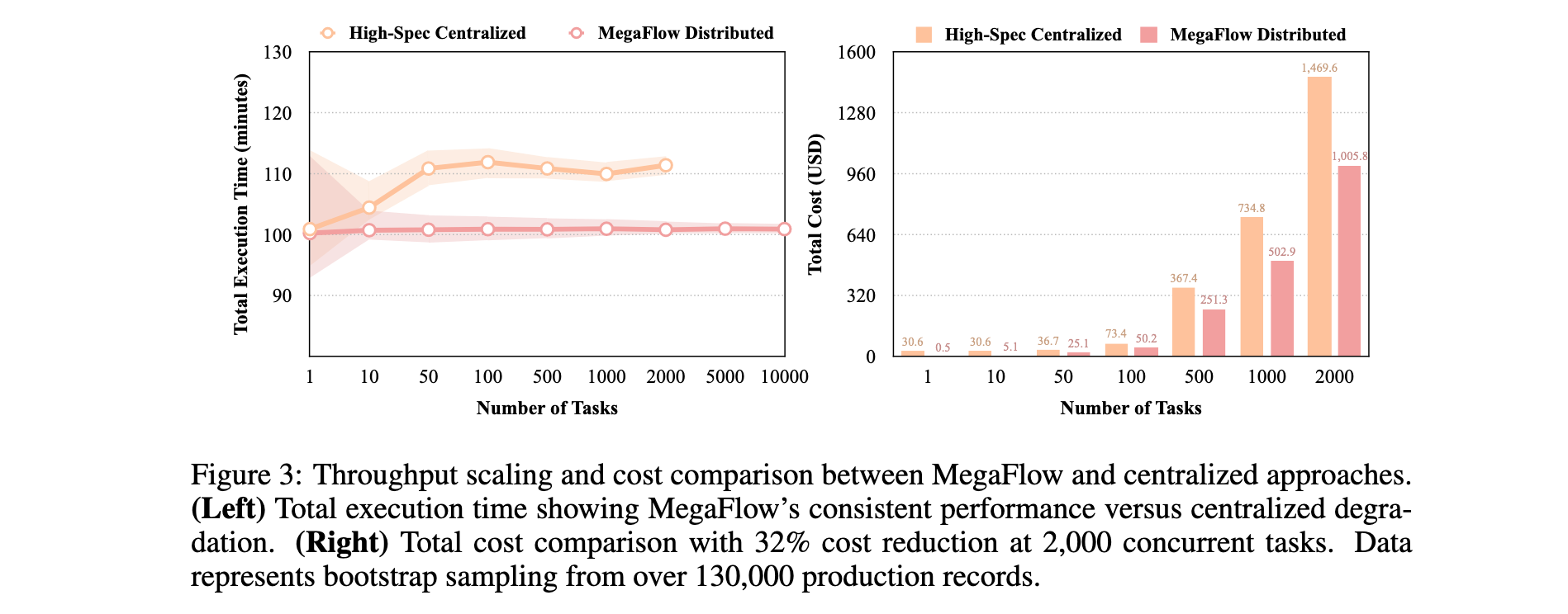 吞吐量和可扩展性分析:如图3所示,MegaFlow在1到10,000个任务中保持约100分钟的一致执行时间,高规格集中式方法由于资源争用从100分钟退化到110分钟。集中式方法受实例可用性限制在2,000个并发任务,MegaFlow能够配置10,000个实例。在2,000个任务时,MegaFlow实现32%成本降低(1,005美元对1,470美元)。