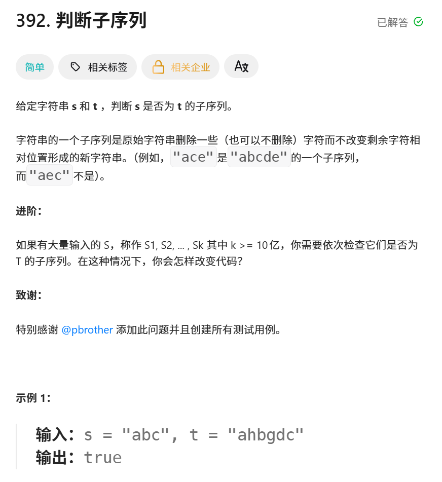 看别人的动态规划解法的时候,对 dp[i][j] 代表了什么一无所知就看不懂代码。要是把 dp[i][j] 理解为 s 字符串出现在 t[i:j] 中,即 t 中以 i 下标开始,j 下标结束的子字符串包含了 s,那要是不包含呢?岂不是解不出来。所以 dp[i][j] 就代表 s[0:i] 和 t[0:j] 的公共字符串长度,如果最后它等于 s.length ,那么s 字符串就被 t 字符串所包含。