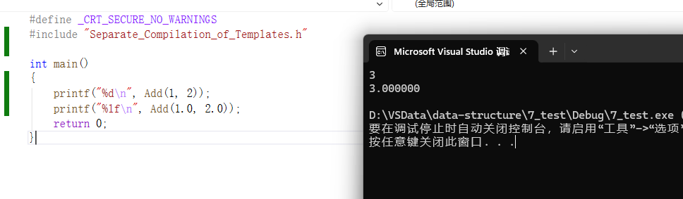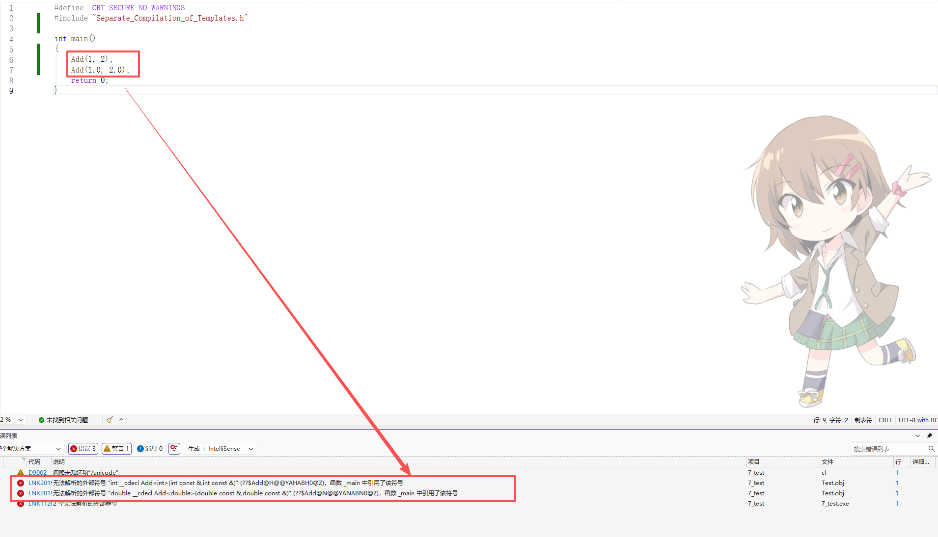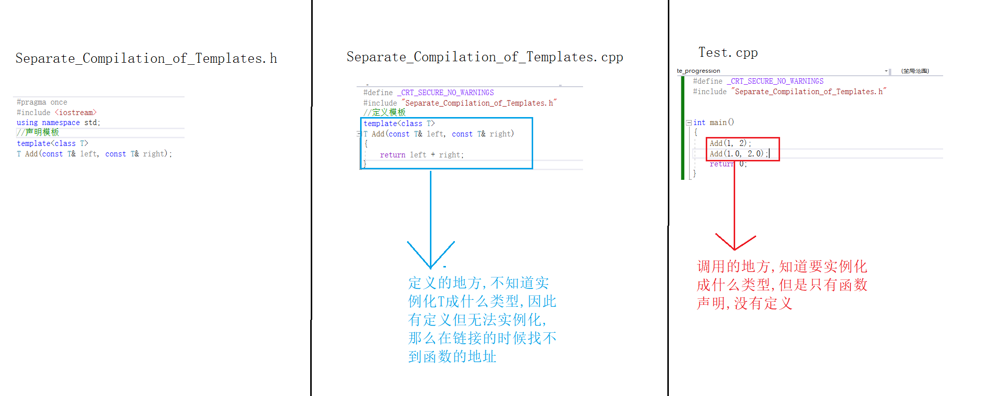 假如有以下场景,模板的声明与定义分离开,在头文件中进行声明,源文件中完成定义.
