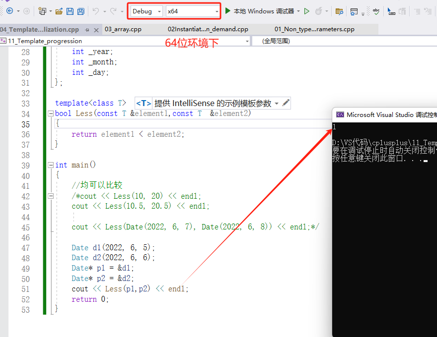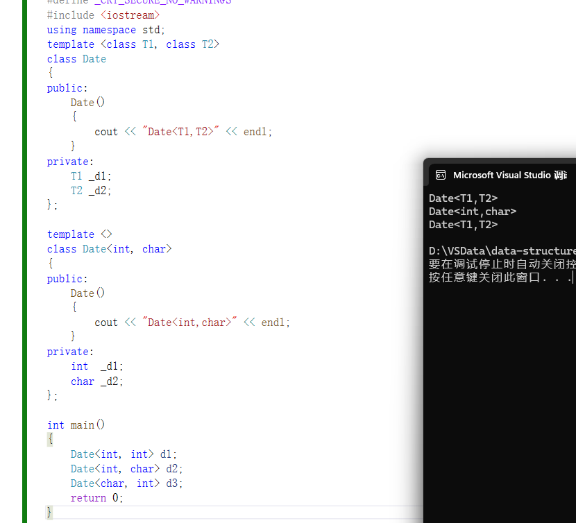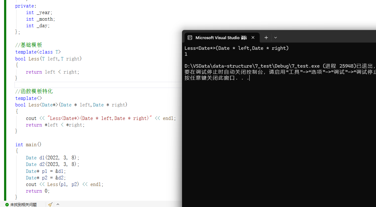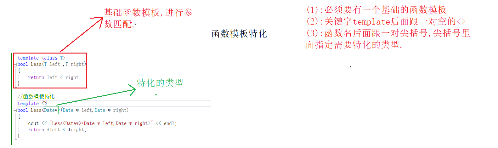 通常情况下,使用模板可以实现一些与类型无关的代码,但对于一些特殊类型的可能会得到一些错误的结果,需要特殊处理,比如:实现了一个专门用来进行小于比较的函数模板.