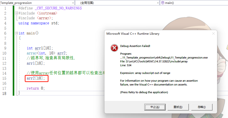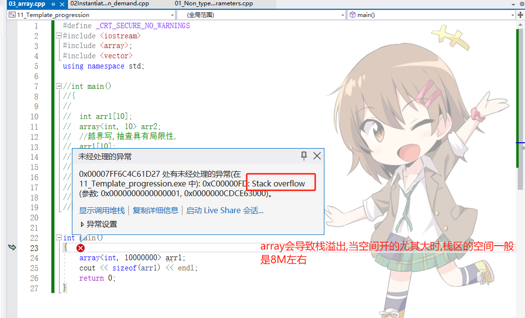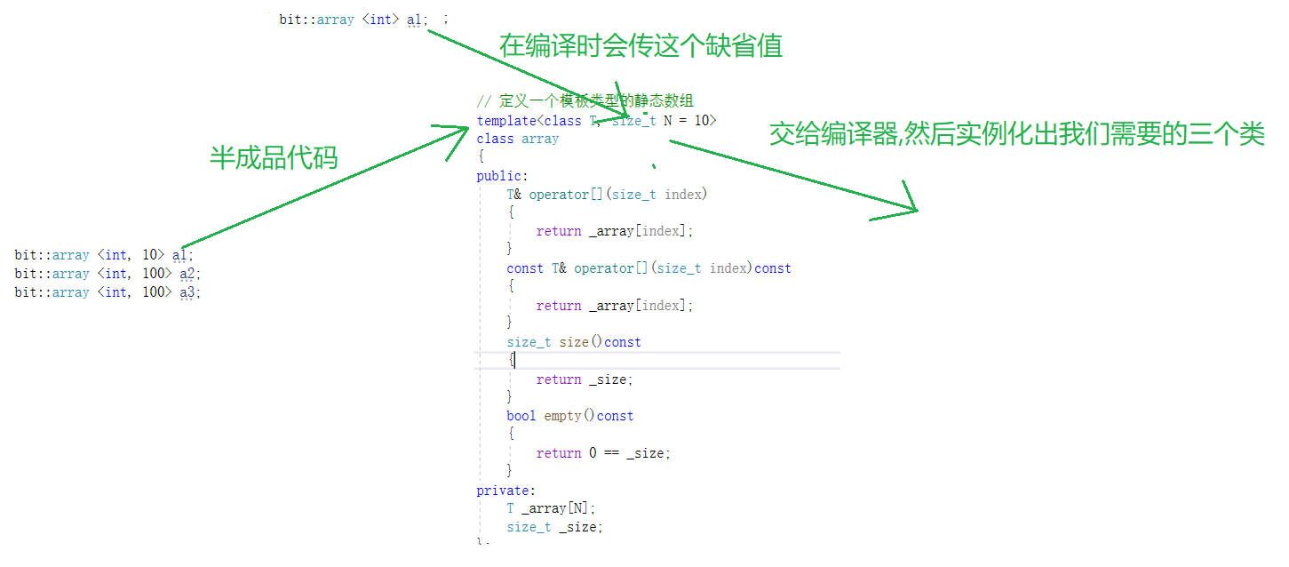 - 非类型形参,就是用一个常量作为类(函数)模板的一个参数,在类(函数)模板中可将该参数当成常量来使用.