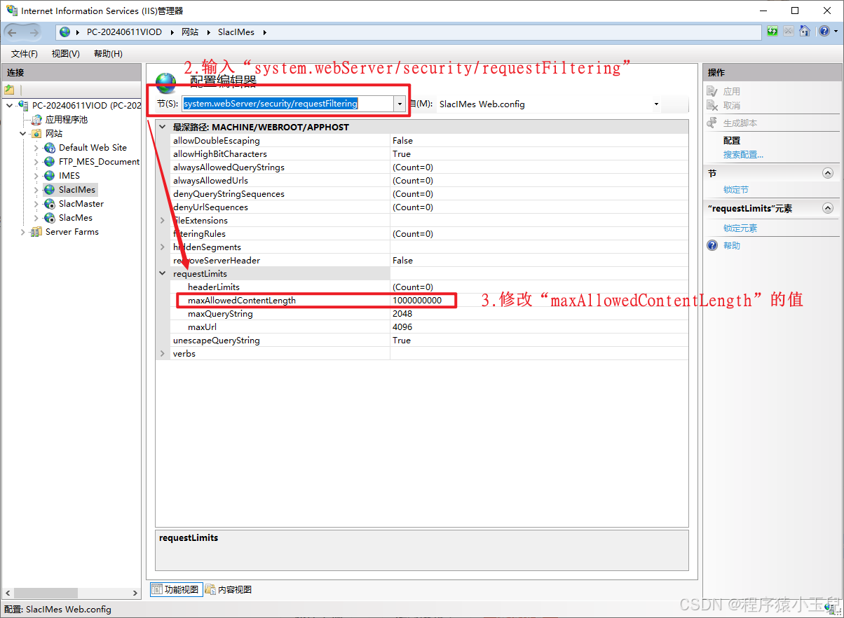 - 在"节(s):"输入system.webServer/security/requestFiltering,找到"requestLimits"中的"maxAllowedContentLength",修改成需要限制的文件大小(此处指的是字节bytes,我这里设置1000000000约等于1G)