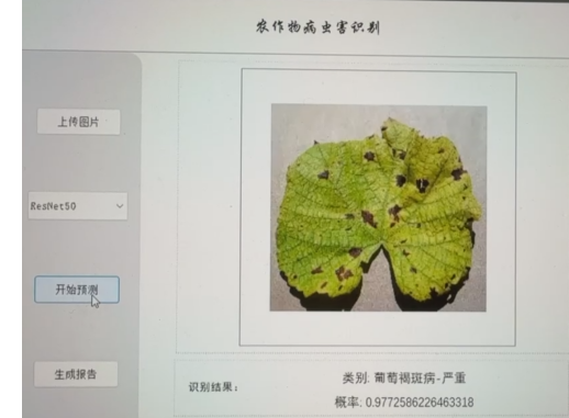 本设计基于深度学习的作物病害识别系统,利用计算机视觉与人工智能技术,实现对作物病害的多属性自动识别与分类。系统采用 Python 语言开发,后端使用 PyCharm 作为主要开发环境,负责模型调用、图像处理与属性推理;前端则基于 PyQt5 构建图形用户界面,实现图像导入、分类结果展示与用户交互等功能。系统可实现对输入作物病害的葡萄褐斑病、番茄叶霉病等病态的检测,并生成相应的治理报告和方案,具备较强的实用性与智能化程度。