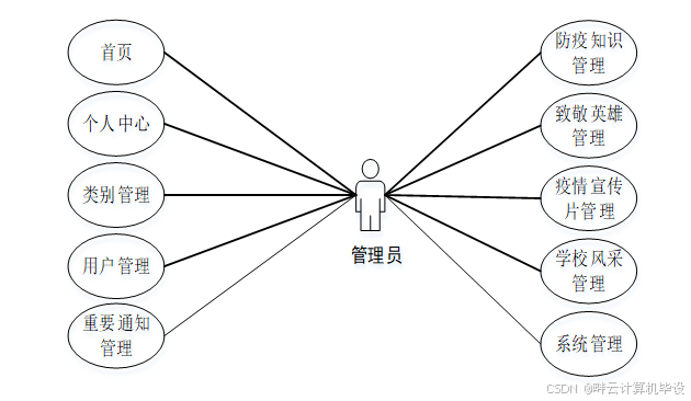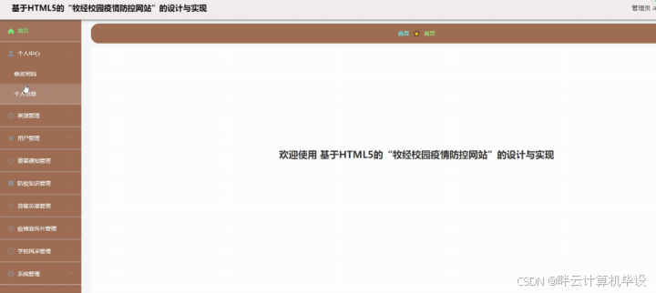 管理员登录进入基于HTML5的"牧经校园疫情防控网站"可以查看首页、个人中心、类别管理、用户管理、重要通知管理、防疫知识管理、致敬英雄管理、疫情宣传片管理、学校风采管理、系统管理等内容,如图5-3所示。