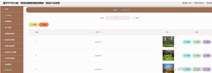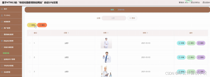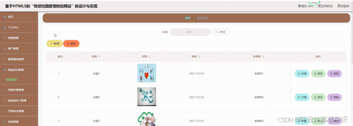 防疫知识管理,在防疫知识管理页面可以查看标题、封面、时间、来源网、内容等信息等进行添加、修改、删除等操作,如图5-6所示。