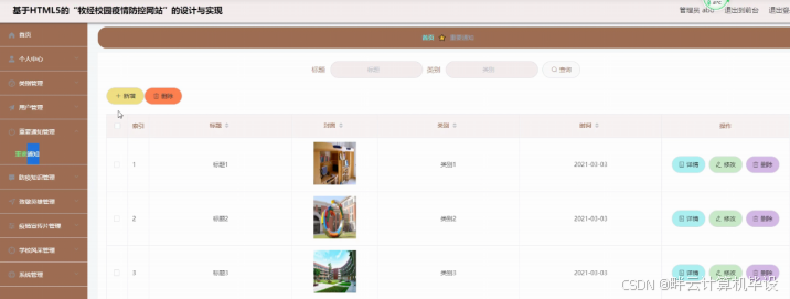 重要通知管理,在重要通知管理页面可以查看标题、封面、类别、时间等内容,并可根据需要对重要通知进行添加,修改或删除等操作,如图5-5所示。