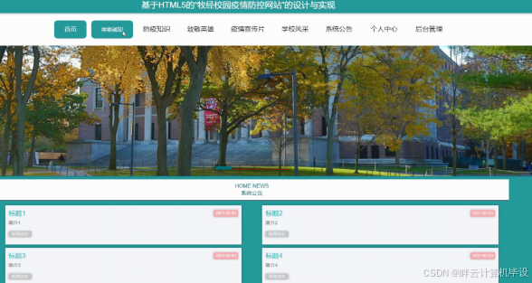 基于HTML5的"牧经校园疫情防控网站",在系统首页可以查看首页、重要通知、防疫知识、致敬英雄、疫情宣传片、学校风采、系统公告、个人中心、后台管理等内容,如图5-1所示。