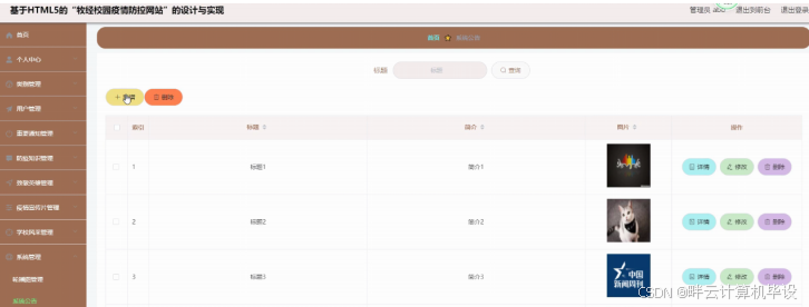 系统公告管理,在系统公告管理页面可以查看标题、简介、图片等内容,并可根据需要对系统公告管理信息进行修改,删除或查询详细内容等操作,如图5-11所示