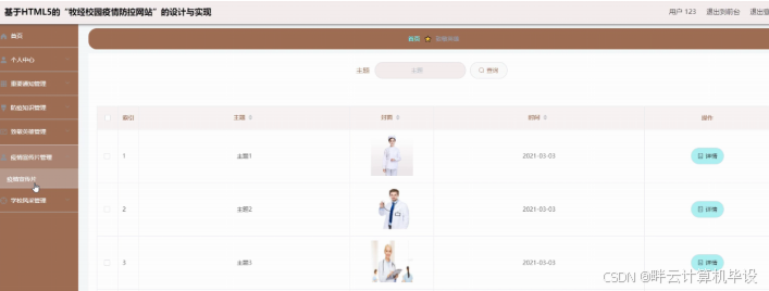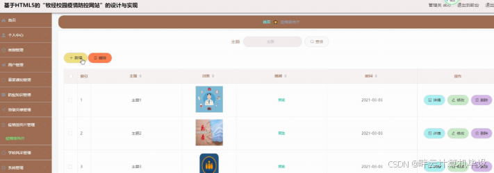 疫情宣传片管理,在疫情宣传片管理页面可以查看主题、封面、视频、时间等内容,并可根据需要对疫情宣传片管理进行添加,修改,删除或查询详细内容等操作,如图5-8所示。