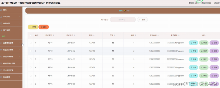 用户管理,在用户管理页面可以查看用户账号、用户姓名、密码、性别、年龄、联系电话、电子邮箱等内容,并可根据需要对用户管理进行添加,修改或删除等操作,如图5-4所示。