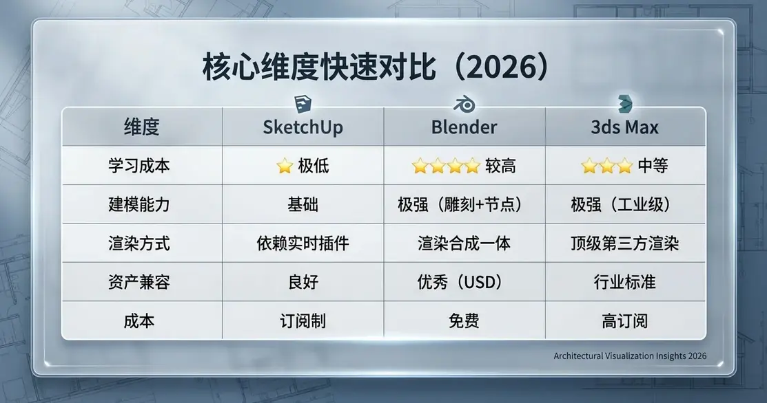 趋势提醒 : 2026 年的关键词不再是"单一软件",而是 跨软件协作 + 云渲染加速。 SketchUp 的方案、Blender 的资产、3ds Max 的最终表现,已经可以无缝衔接。