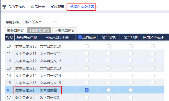 2、单据自定义设置中,选生产任务单,上表体自定义,启用一个数字自定义1,改显示名称为:大单位数量。其他单据都一样的操作方式 。