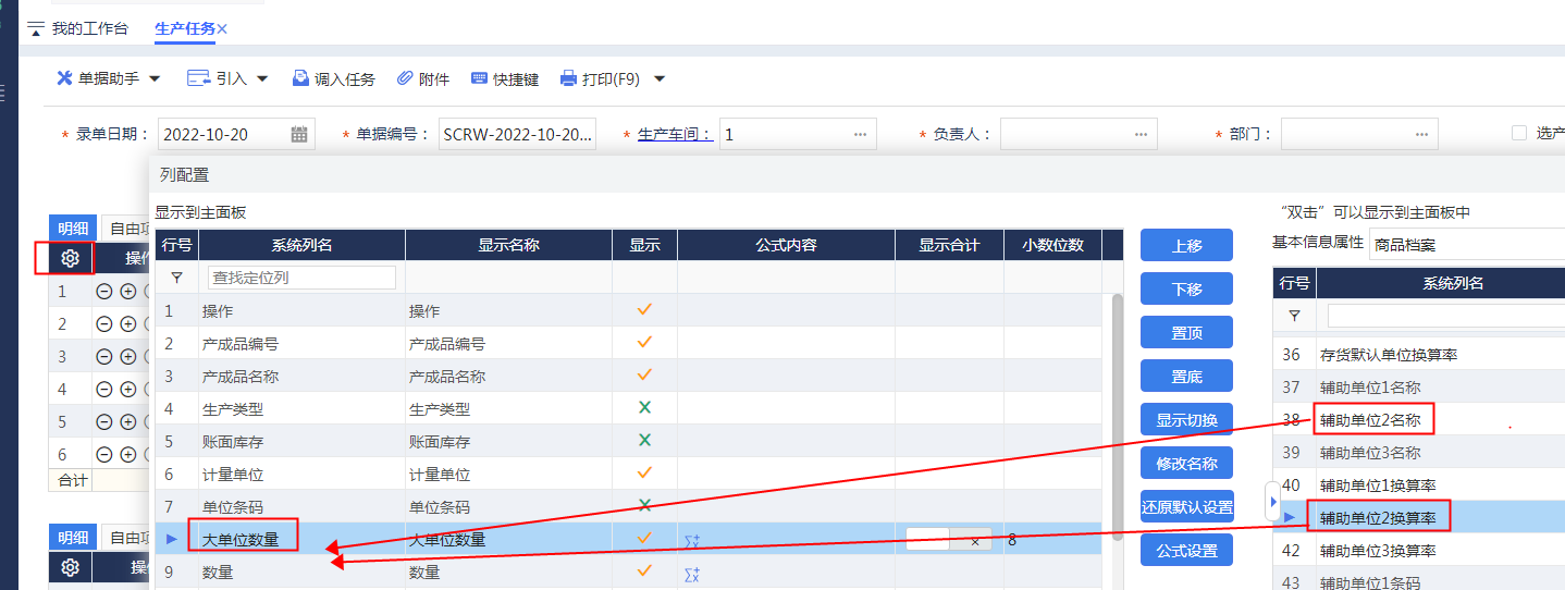 3、打开任务单,上表体,点击齿轮,打开列配置,把右边框里面的:辅助单位2名称、辅助单位2换算率双击到左边框中。任务单就显示了大单位数量(自定义字段)等相关列了