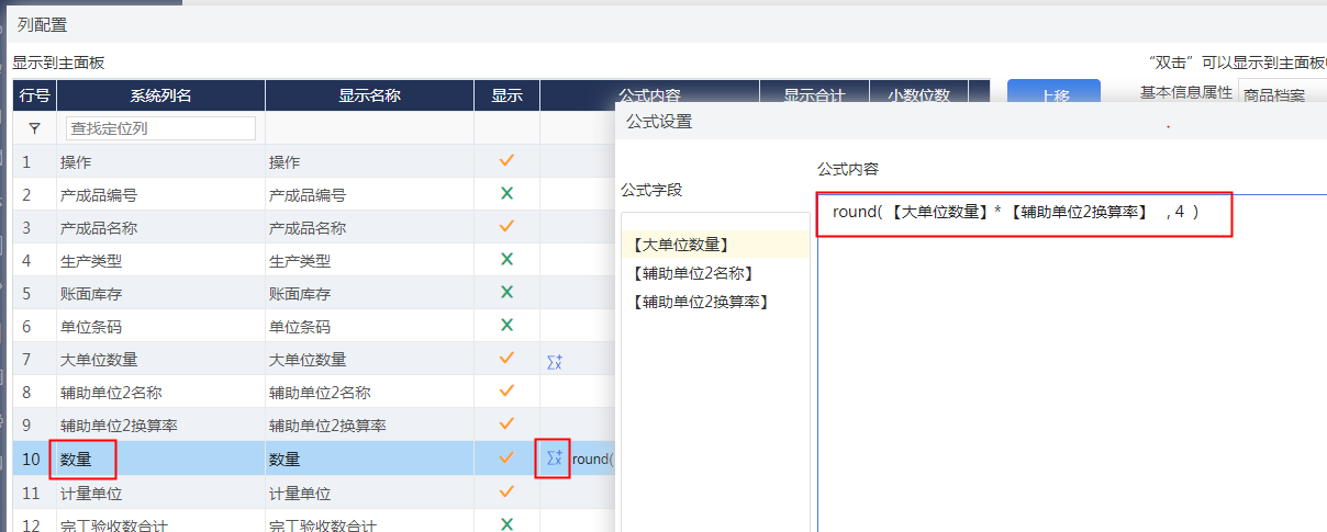 4、对"数量"列设置公式:round( 【大单位数量】* 【辅助单位2换算率】 , 4 ),公式里面的这个4表示取4位小数,可以根据客户的需求自己改,录入大于等于0的整数就可以。