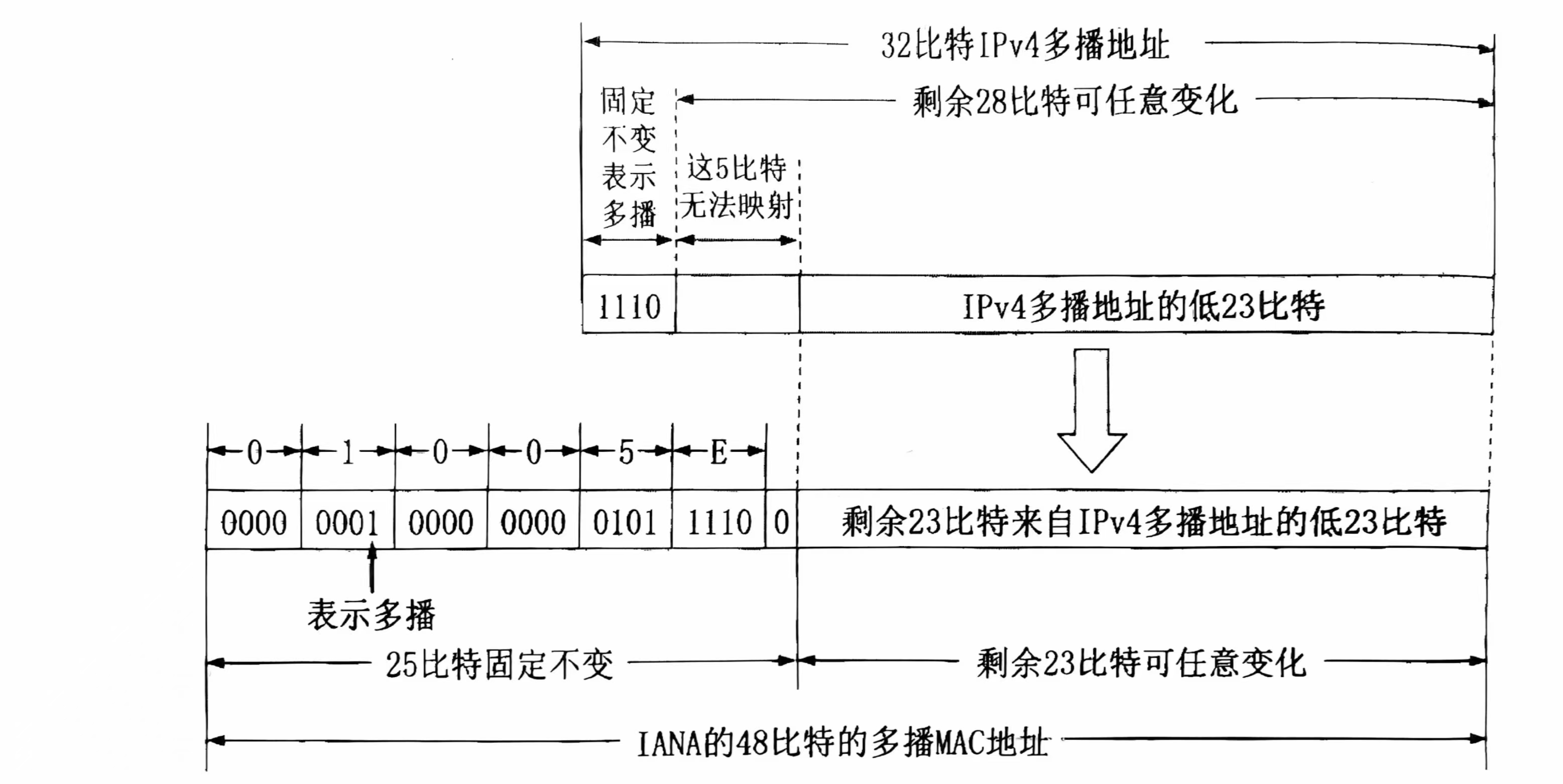 由于IPv4多播地址有28位可变,而MAC地址仅23位可变,因此映射关系不唯一(1个MAC地址对应32个IPv4多播地址)