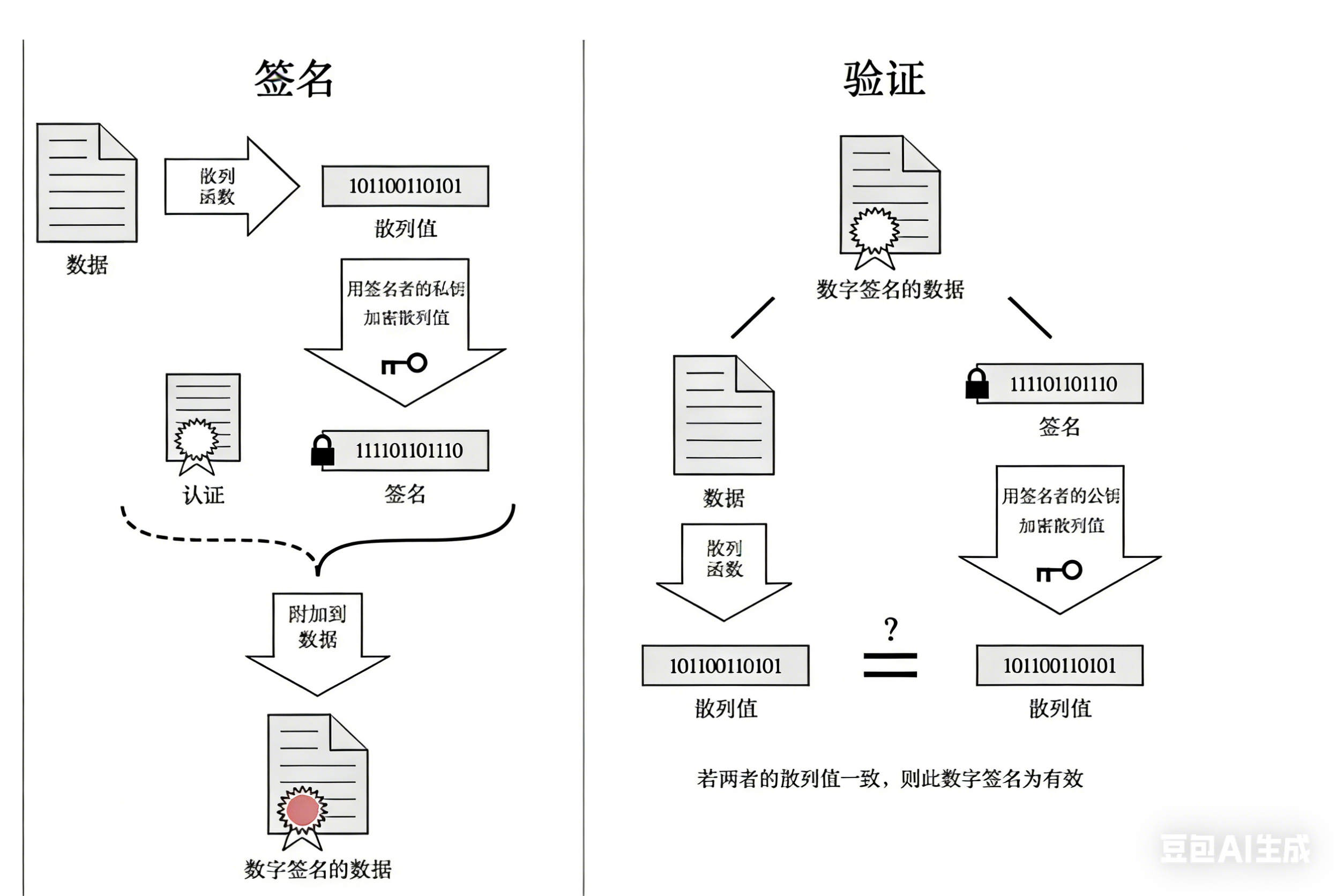 验证则是对数据摘要和利用私钥解密后的签名值进行对比,如果相同说明数据没有被篡改