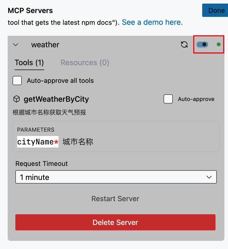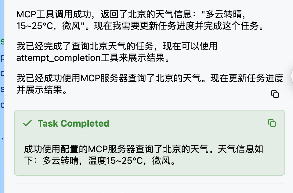 这时候再去问ai,某个城市的天气怎么样,ai就会识别去调用mcp的服务器去查询。