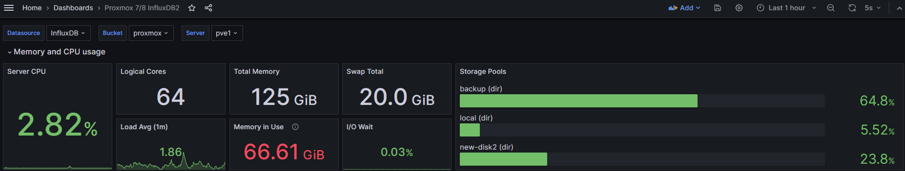 打开「Datacenter → Metric Server → InfluxDB」开关,数据会实时推送到 InfluxDB 2.x,再用官方 Grafana 模板,
