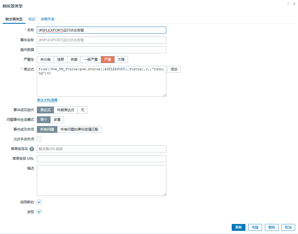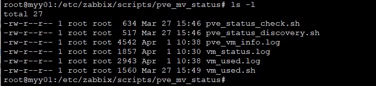 | root@myy01:/etc/zabbix/scripts/pve_mv_status# cd /etc/zabbix/zabbix_agentd.d/ root@myy01:/etc/zabbix/zabbix_agentd.d# cat pve_status.conf UserParameter=pve.status.discovery, /bin/sh /etc/zabbix/scripts/pve_mv_status/pve_status_discovery.sh UserParameter=pve.status[*], /bin/sh /etc/zabbix/scripts/pve_mv_status/pve_status_check.sh 1 2 |